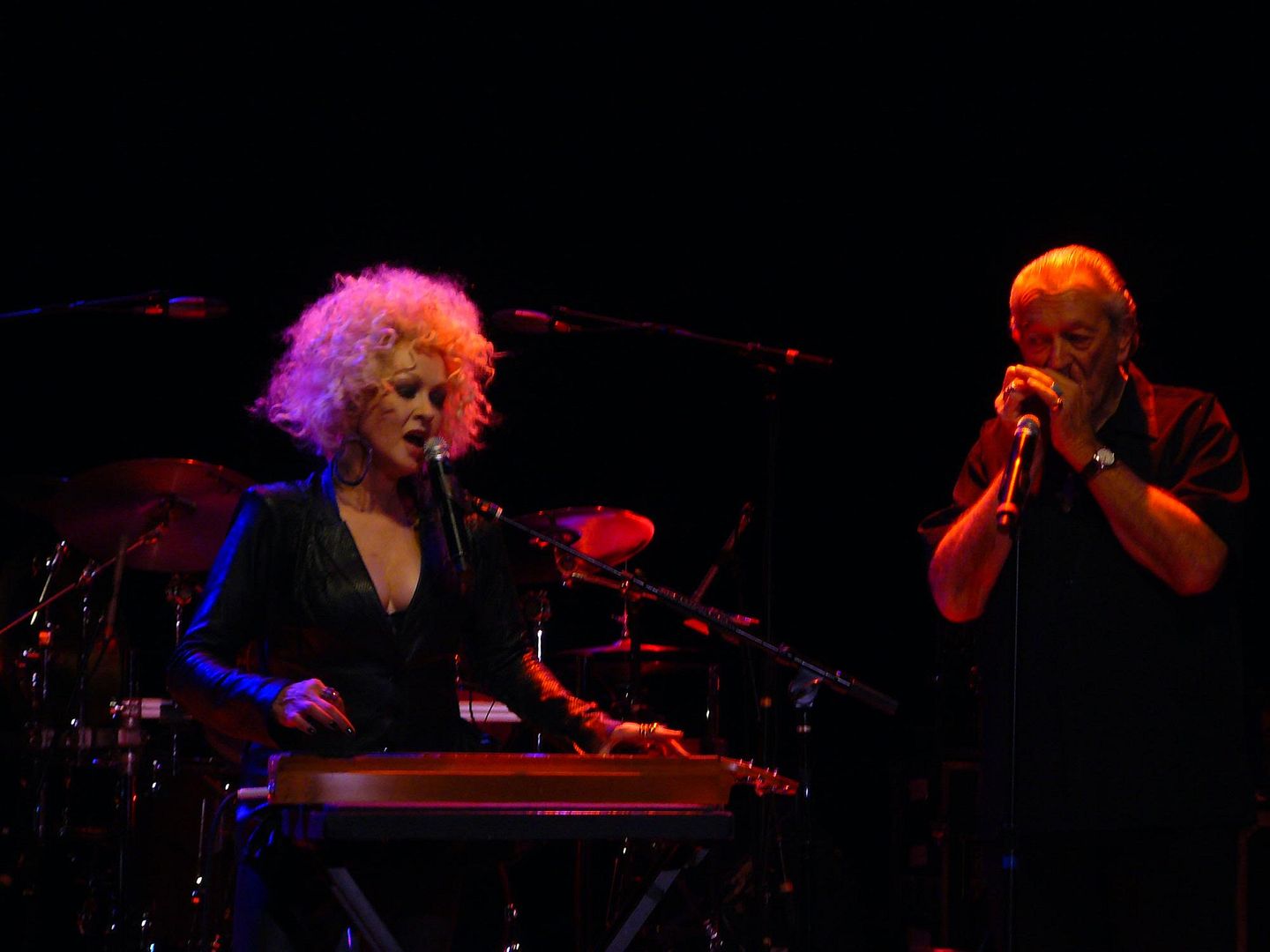 1. Cyndi Lauper appeared in concert at the Ogden Theatre, 11/1/11. Here she is seen accompanied by legendary blues musician Charlie Musselwhite, performing the last song of the evening, "True Colors".
