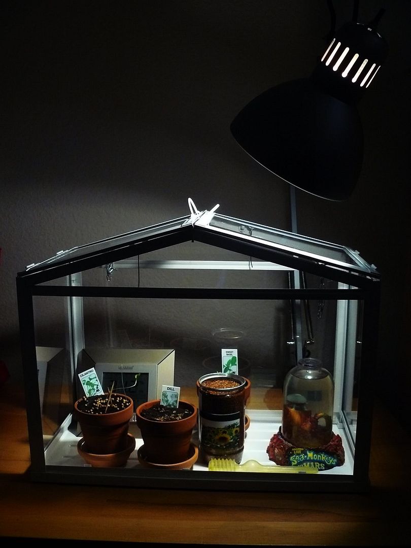 1. I've been growing a Chia herb garden. But my apartment doesn't really have any sun-facing windows, and the little plants were finally starting to hurt for it. So I got a grow-bulb, and then yesterday bought this mini-greenhouse from IKEA.